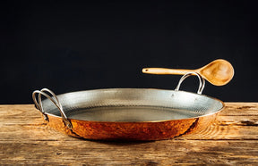 Crafted to perfection, the paella pan boasts a robust 2mm thickness of hammered copper. This not only guarantees exceptional heat distribution for uniform cooking but also showcases the skillful artistry that goes into each pan's creation. The traditional hot-tinned interior elevates your cooking experience, offering a durable, non-reactive surface that stands the test of time.