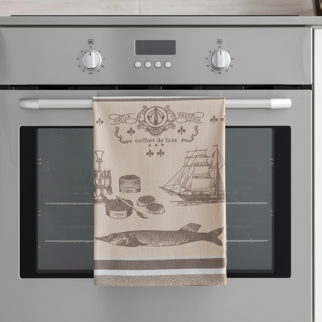 But it’s not just about practicality; this decorative tea towel is also a feast for the eyes. Adorned with charming graphics of sturgeons, ships, and pots of caviar, it adds a touch of nautical elegance to your kitchen. The soothing brown and beige tones create a warm ambiance that complements any décor.